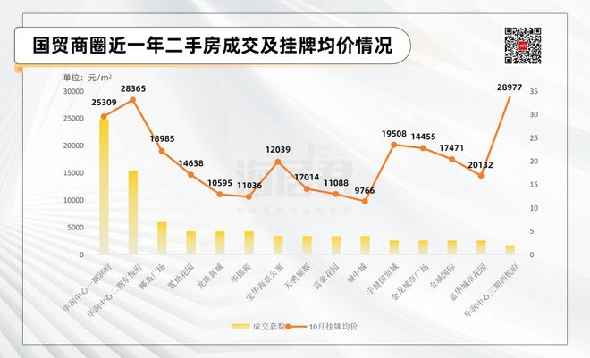 贝壳找房数据显示,2024年10月华润中心前三期二手房挂牌均价分别达25309元/㎡、28365元/㎡、28977元/㎡,均跻身国贸商圈二手房挂牌均价前三甲。